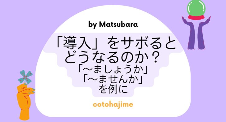 Contents1 「導入」をサボるとどうなるのか?「~ましょうか」「~ませんか」を例に1.1 「導入は大事」だというが1.2 この導入の問題点は?1.3 「ましょうか」=「ませんか」?1.4 『GE...