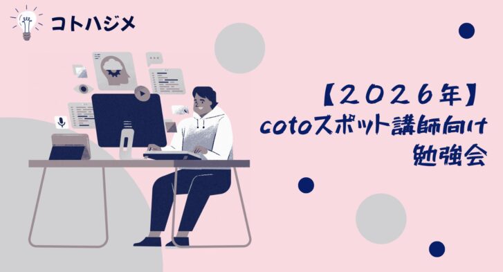 Contents1 【2026年】cotoスポット講師向け勉強会1.1 日時および内容(予定)1.2 勉強会までの申込フロー1.3 その他 【2026年】cotoスポット講師向け勉強会 2025年から...